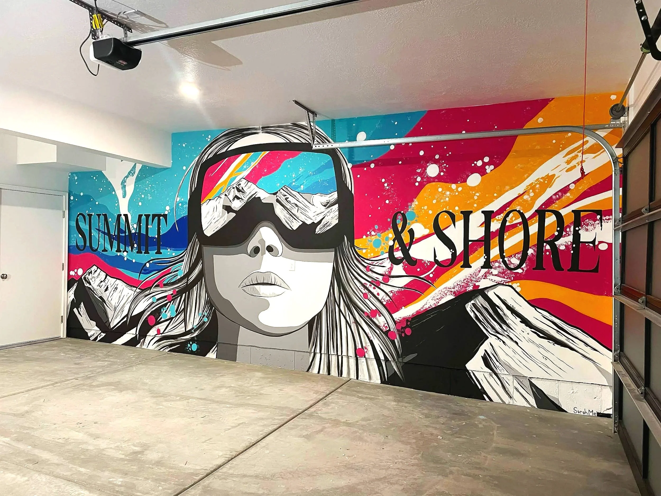 This custom mural features a stylized snowboarder with mountain-reflecting goggles, creating a bold, high-energy focal point for this Park City vacation rental. Perfect for Airbnb guests and winter sports enthusiasts alike.
